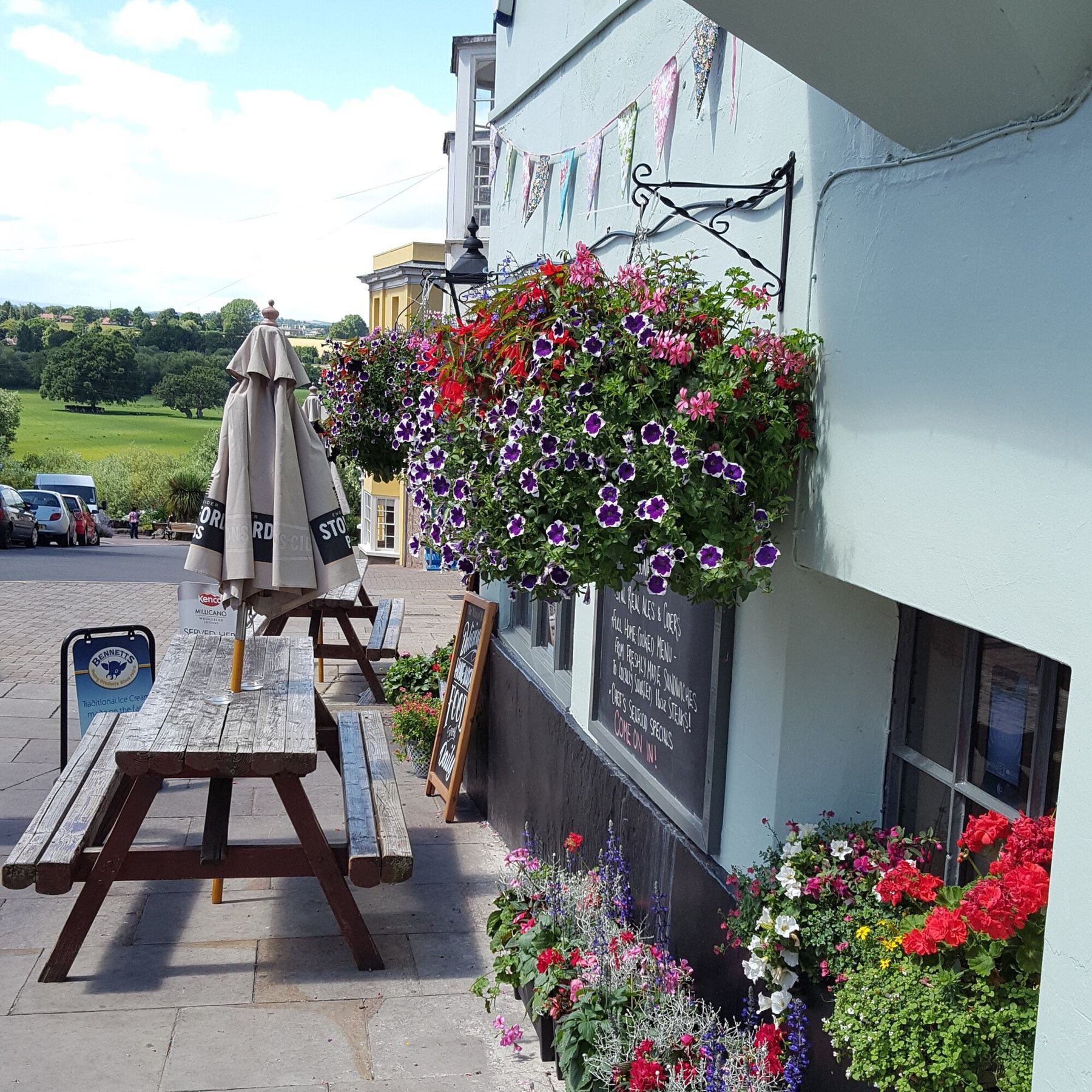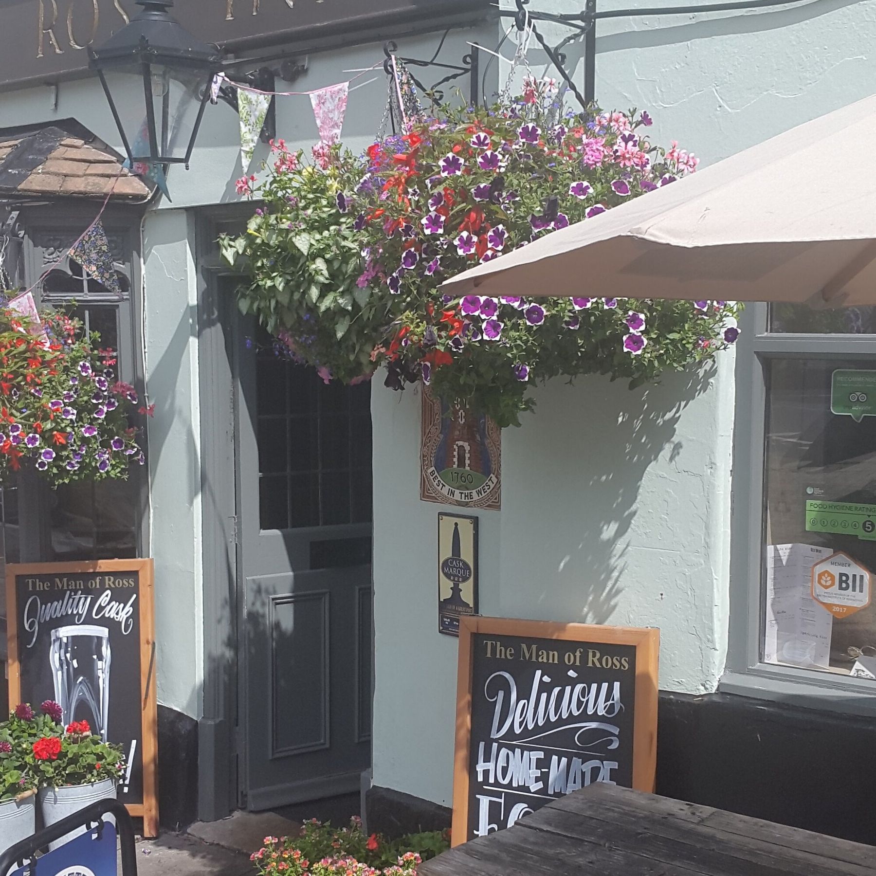 We’re a locally run family business located just a 2-minute walk away from the River Wye and Ross-on-Wye town centre. We have a courtyard outdoor seating area which is ideal for sunny days, enjoying a stunning view of the surrounding Wye Valley and beyond – blankets and patio heaters are available for those chillier evenings! During the winter months, you’ll be grateful to come in from the cold and sit in our cosy bar next to the wood burner. We serve generous portions of home-cooked food making use of local produce (including the local specials’ menu varying from fresh seafood dishes to sharing platters). We recommend those hungry enough to try our giant tempura battered Fish & Chips which are available to eat in or take away. A smaller children’s menu is also available along with our popular ‘Mr Whippy’ style ice cream machine. Our wide-ranging drinks selection has something for everyone, including award-winning real ales, local ciders, gins, and teas & coffees. Muddy boots and four-legged friends are welcome outside and in our bar area. We’ve proudly been awarded several accolades over the last few years including the Cask Marque Certificate of Excellence, ‘Best Pub and Bar in Ross-on-Wye’ by Restaurant Guru, TripAdvisor Certificate of Excellence, and a 5 Star Food Hygiene rating.