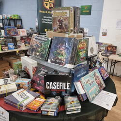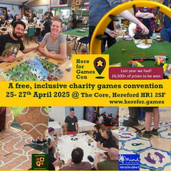 Our convention has slowly grown and each year we’ve improved our accessibility and inclusion. Hopefully we’ll have something for everyone from veteran gamers to newbies to families. Huge games library, friendly teachers, RPGs, giant games, events, bring & buy traders and more! Free Entry and all proceeds go to charity Herefordshire Mind. Our 10th year, in 2023 we raised nearly £4,000 raised for Mind! 400 unique guests, 600 footfall in person and online! Glowing feedback! As friendly and welcoming as we hoped! Loads of prizes to be won in our in-person and online raffle, there will be food and drink available to purchase at very reasonable prices and our board game shop!