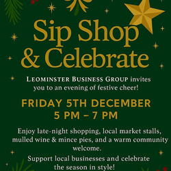 Get into the festive spirit at Sip, Shop & Celebrate in Leominster! Join us on Friday 5th December from 5 PM to 7 PM for an evening of community cheer and local shopping. Discover a variety of independent market stalls, enjoy live music, and treat yourself to delicious food, mulled wine, and mince pies as you browse. This special late-night shopping event is the perfect opportunity to find unique Christmas gifts while supporting local businesses from Leominster and the surrounding areas.